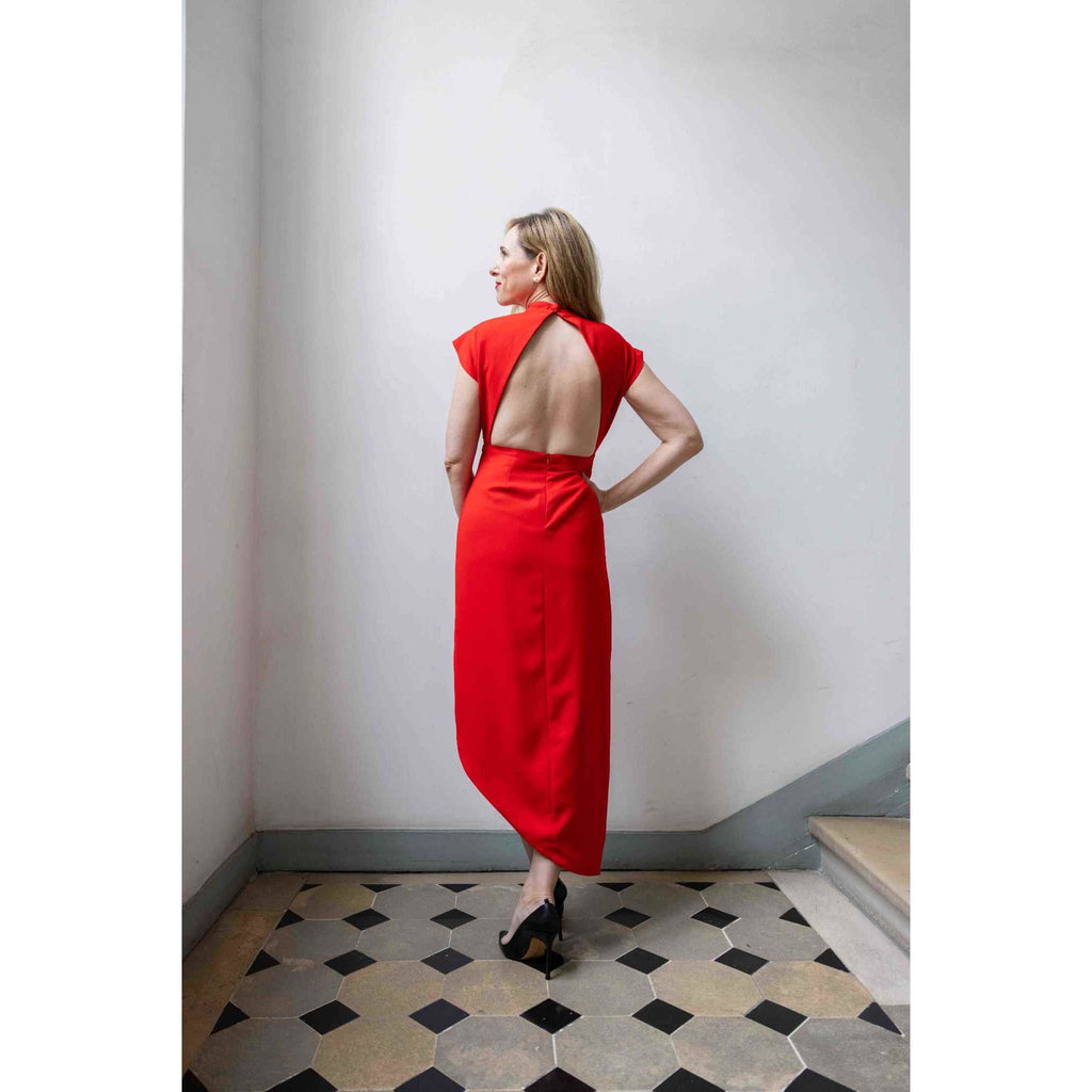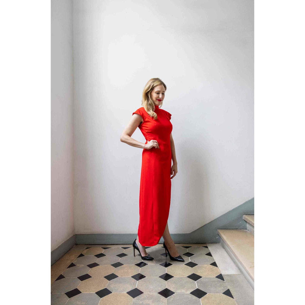 Introducing our Red Mandarin Collar Tulip Skirt Dress, a chic blend of sophistication and playful charm. Made from a luxurious silk-poly blend, this dress features a vibrant red hue that radiates confidence.